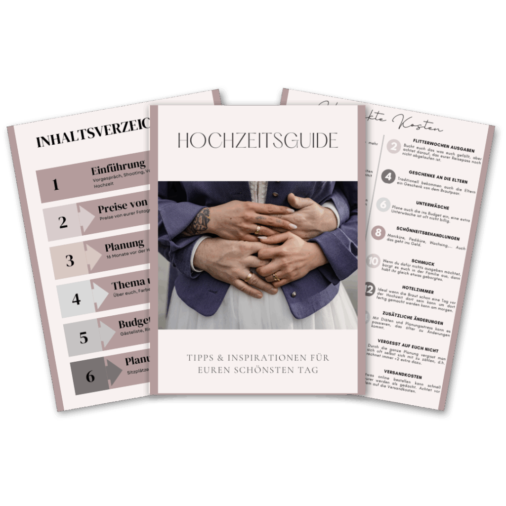 Ich weiß aus eigener Erfahrung, wie überwältigend die Hochzeitsplanung am Anfang sein kann. Deshalb habe ich einen kompakten Guide erstellt, der dir den Einstieg erleichtert – und den bekommst du von mir geschenkt!