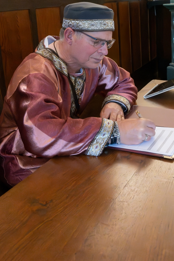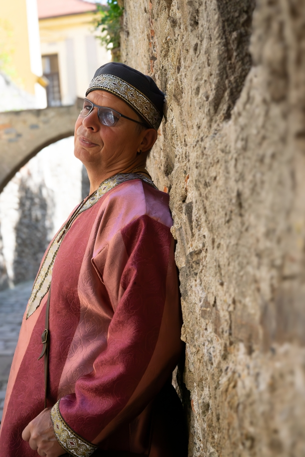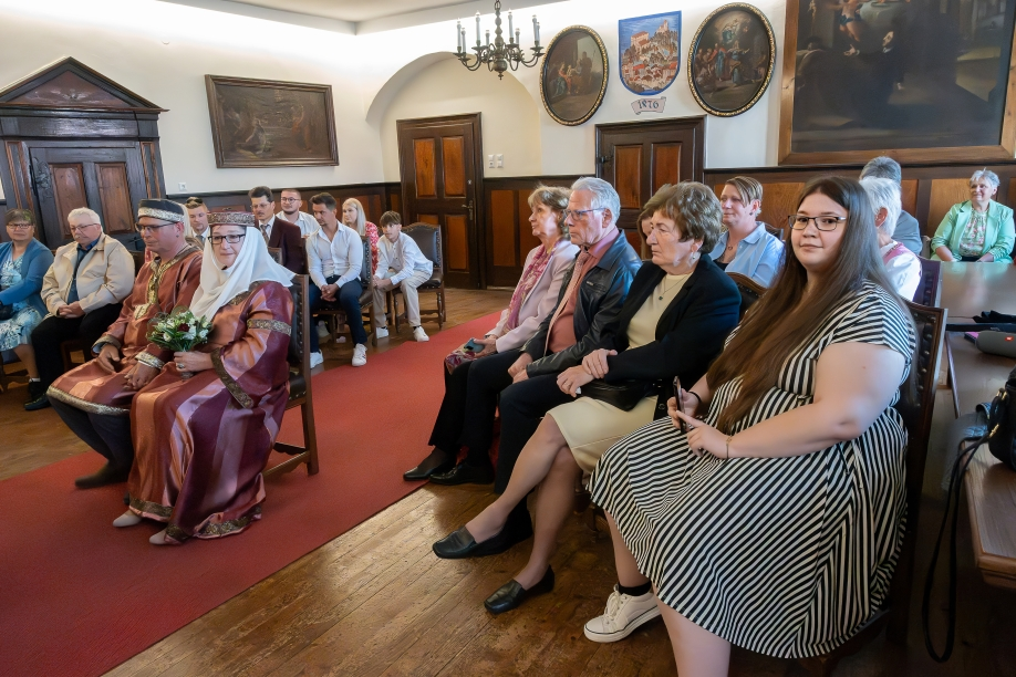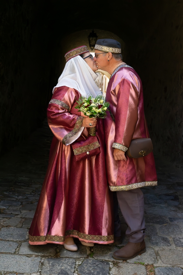 Auch der Bräutigam hatte seine Gewandung selbst angefertigt. Gemeinsam sahen sie aus, als wären sie einem historischen Roman entsprungen – stolz, würdevoll und voller Liebe.